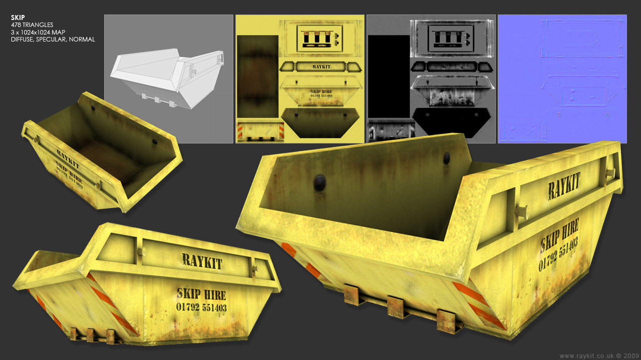 A few areas that I could improve on are the edges on the skip which could of been chamfered to give it a smoother finish, but as this was also my first time at unwrapping UVW I didn’t want to complicate things. Another area would be to add the extra poly to the inside bolts to make it stick out abit more.